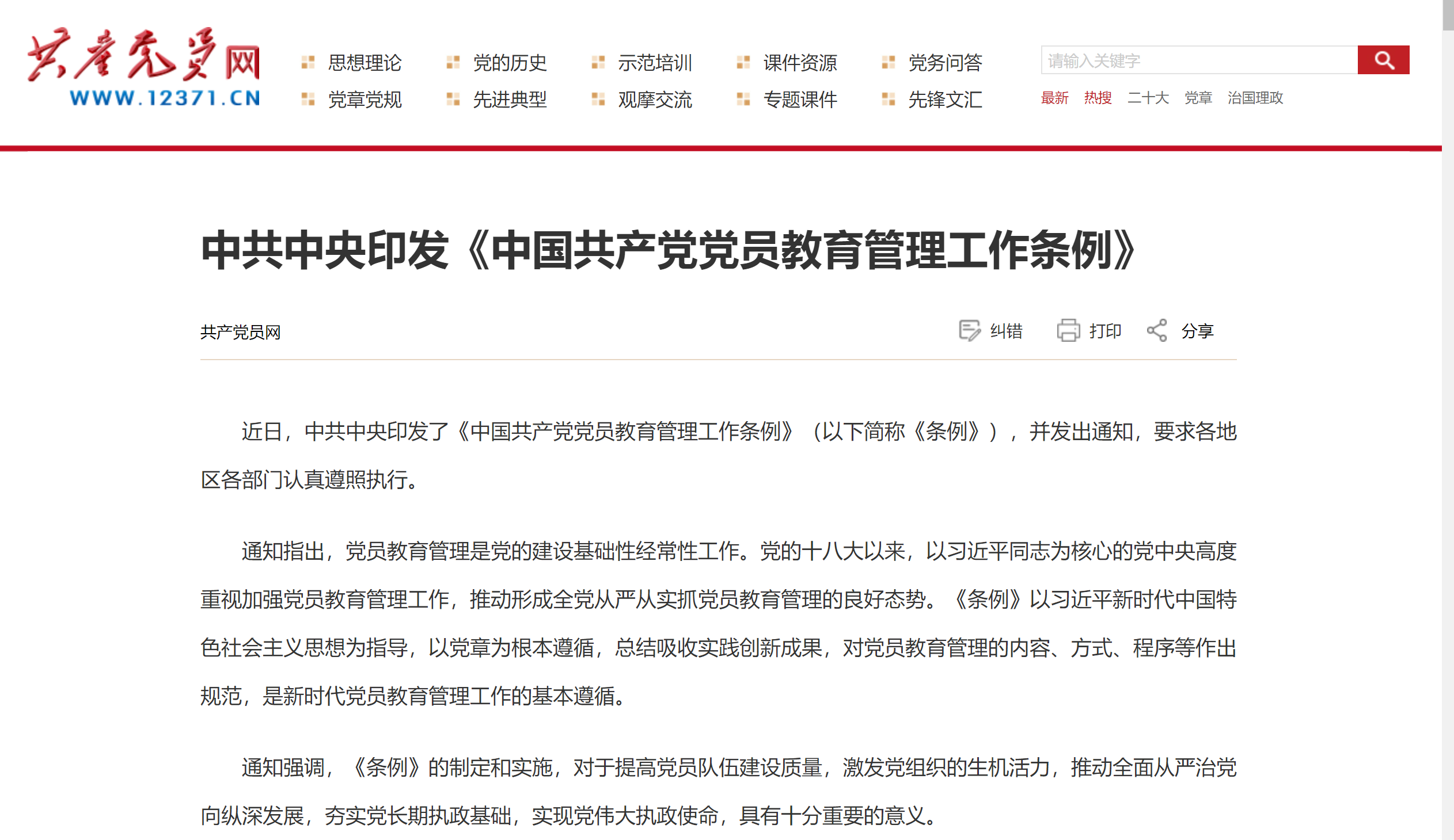 中共中央印发《中国共产党党员教育管理工作条例》_共产党员网 (12371.cn)