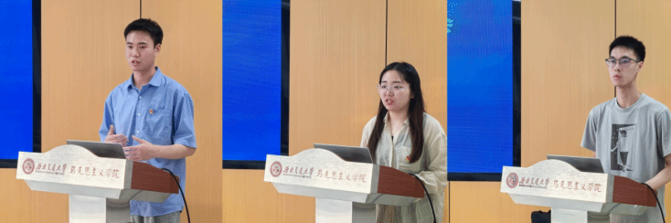 李豪、张天一、祝艺丁三位同志作为毕业生党员代表发言,怀着对马克思主义学院的感恩之心,他们分享了自己的学习体会、实践经历和成长历程,纷纷表示自己将牢记党员身份,不断提升思想政治素质和业务能力,为中华民族伟大复兴贡献青春力量。