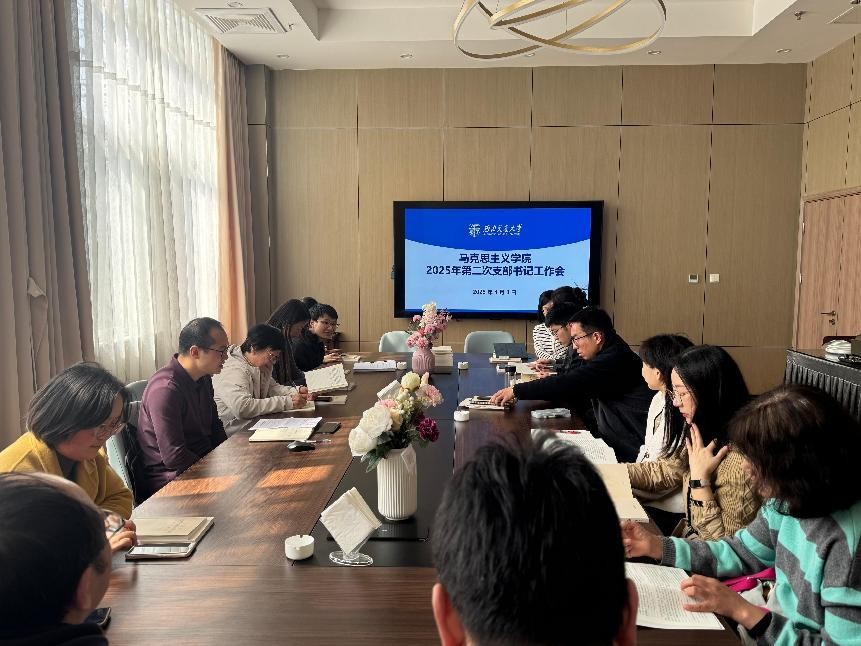 4月3日上午,马克思主义学院在教职工食堂二楼会议室召开了2025年度第二次支部书记工作会议。本次会议由学院党委书记廖军主持,学院党委副书记邓秀芸及全体支部书记参会。