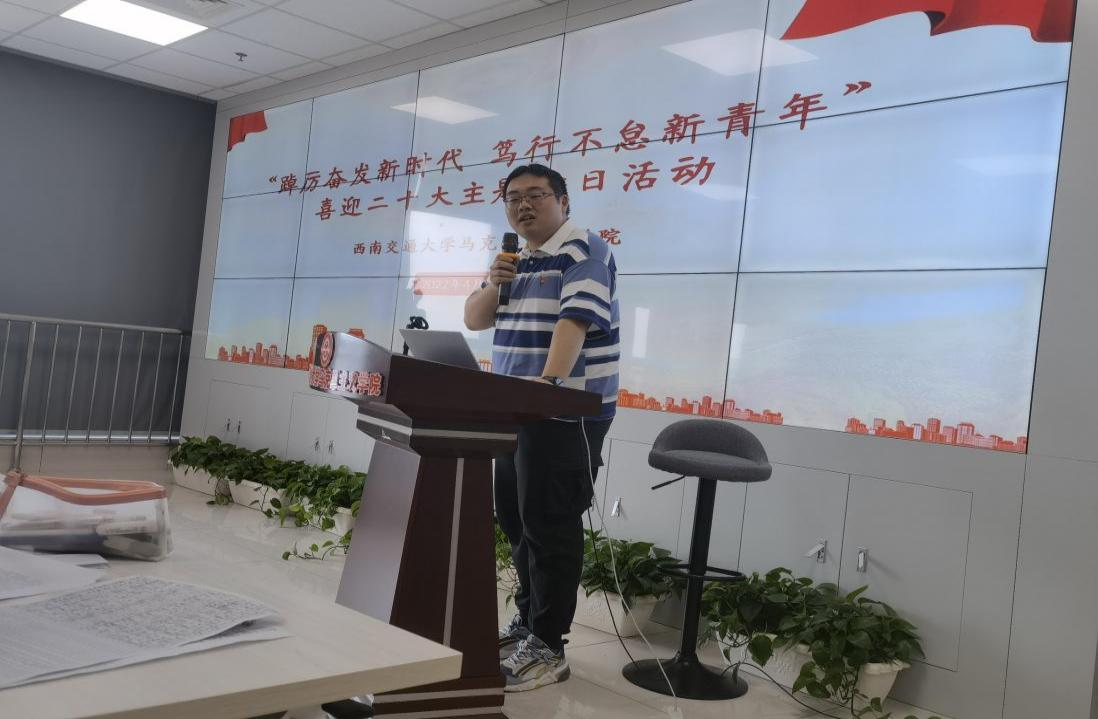 2022年4月23日下午,在X31325学术报告厅,开展了“踔厉奋发新时代、笃行不怠新青年”喜迎二十大主题党日活动暨党课实践教育。此次活动分为专题学习、红歌会以及校史党史知识竞答三个部分,2021级硕士党支部书记李祥瑞主持,学院专职组织员杨雪莲出席,马克思主义学院2022-01期全体入党积极分子参加。