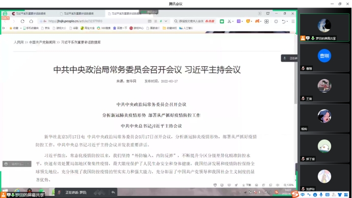 首先,罗田同志带领支部全体同志认真学习了3月17日召开的中共中央政治局常务委员会“分析新冠肺炎疫情形势 部署从严抓好疫情防控工作”会议精神和《“始终坚持人民至上、生命至上” ——习近平总书记指挥打好统筹疫情防控和经济社会发展之战述评》文章,再次要求支部党员同志正确认识当前疫情防控形势,绷紧校园疫情防控这根弦,坚决服从学校学院疫情防控工作安排,严格遵守校园疫情防控纪律,积极发挥党员先锋模范作用,自觉配合学校疫情防控工作。