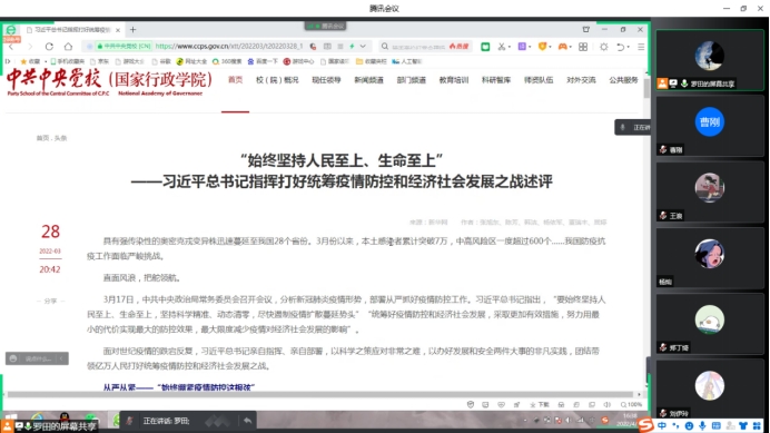 近期全国本土聚集性疫情呈现点多、面广、频发的特点,成都市也相继出现了确诊病例和无症状感染者,校园疫情防控形势严峻复杂。根据学校学院要求,为进一步增强学生疫情防控意识、筑牢校园疫情防控防线,马克思主义学院2020级硕士研究生党支部于4月14日下午组织开展了“携手同心 共守校园”线上主题党日活动。本次会议由党支部书记罗田同志主持,支部全体党员、发展对象以及积极分子参与。
