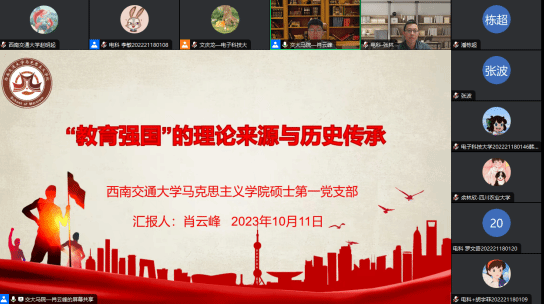 为深入学习贯彻习近平新时代中国特色社会主义思想和党的二十大精神,引导高校青年深刻领会和准确把握建设教育强国的本质属性和丰富内涵,强化建设教育强国的使命担当,西南交通大学马克思主义学院硕士第一党支部于10月11日晚19:30参加“赓续重教尚学优良传统,吹响教育强国建设号角”川内五所“双一流”高校联学联讲活动。