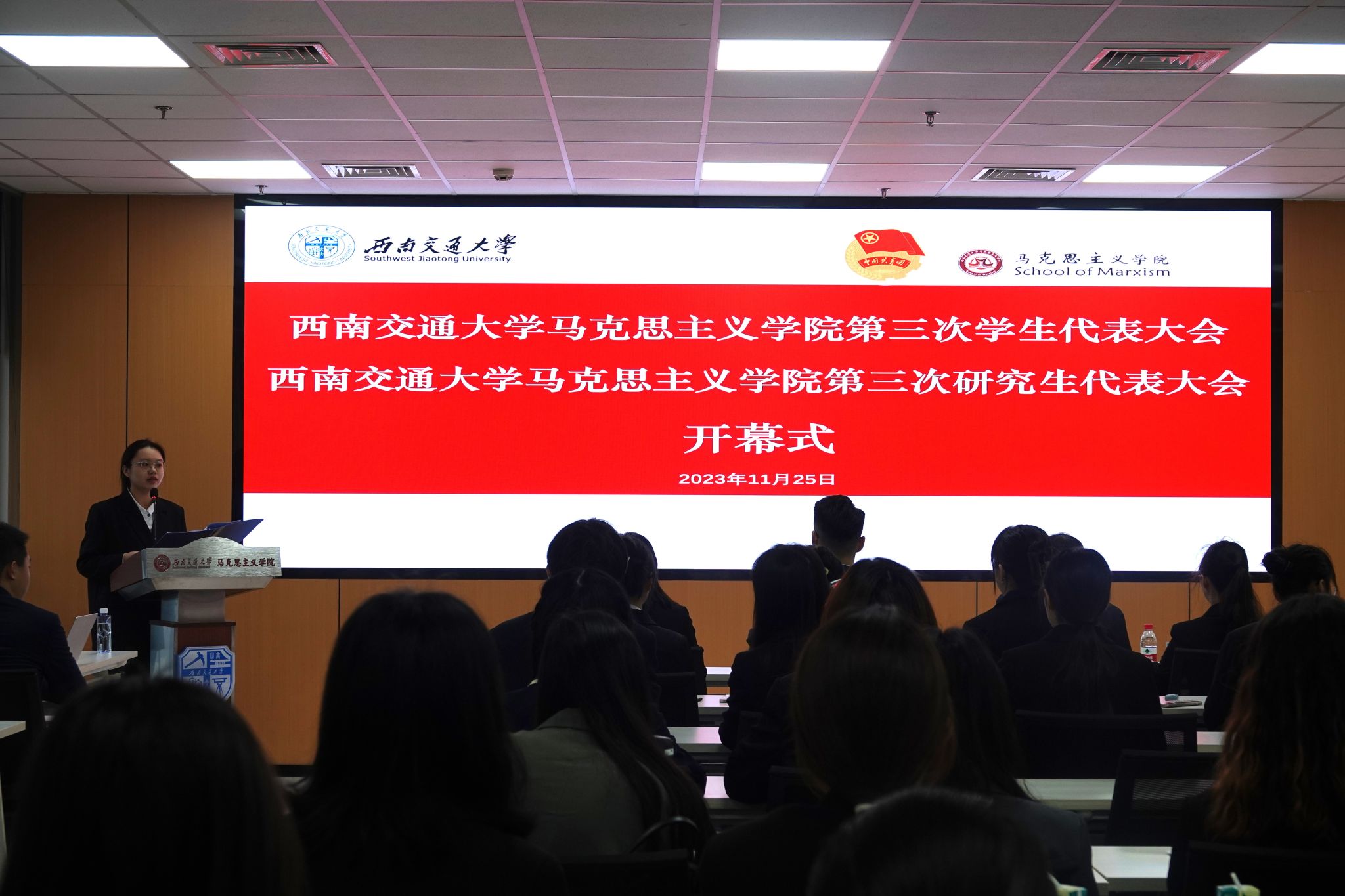 在闭幕式上,院团委书记赵晨老师对全体老师与代表的辛勤付出表示感谢。此外,他勉励新当选的学生会(研究生会)委员会成员与学生会(研究生会)主席团成员,期待他们以更饱满的工作热情与更加认真负责的工作态度维护学生权益,在改革中凝聚共识,在服务中增长才干。最后,大会闭幕,全体起立奏唱校歌,西南交通大学马克思主义学院第三次学生代表大会、第三次研究生代表大会圆满结束。