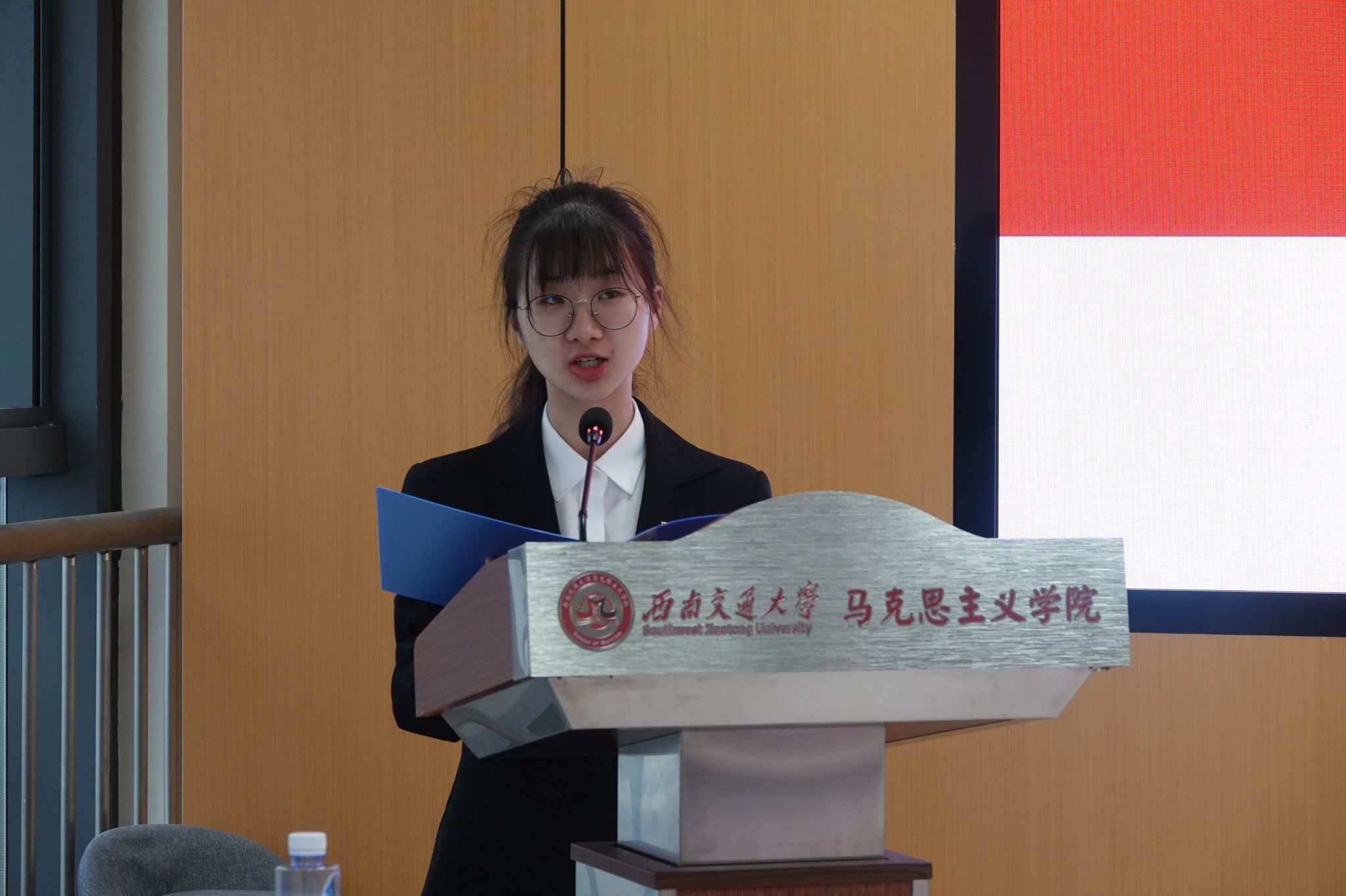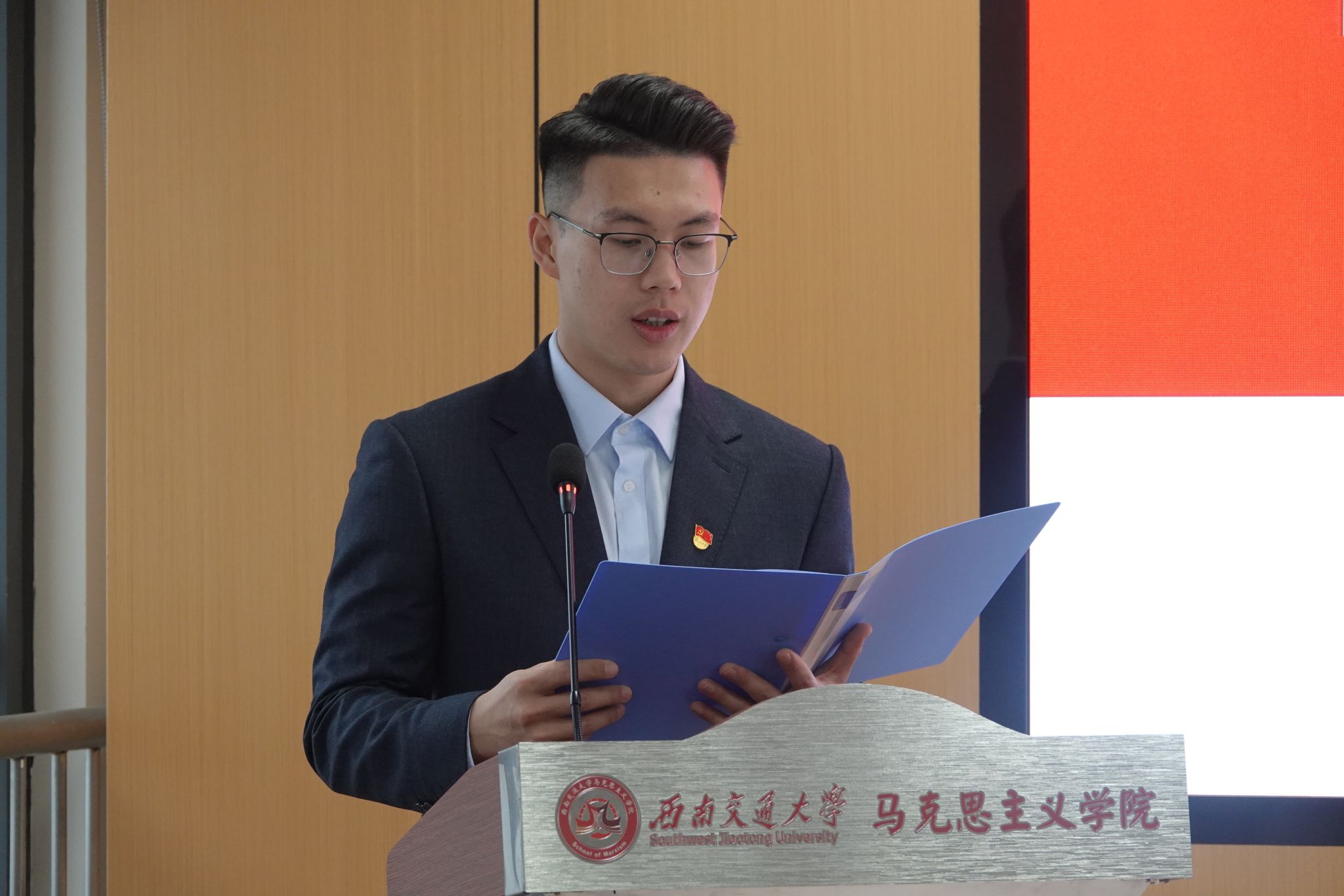 在开幕式上,奏唱国歌后,西南交通大学学生会主席团成员孟珂宇致辞。她对马克思主义学院学生会工作表达了认可和感谢,提出了要进一步深化高校学生组织改革,做有信仰、讲纪律、有原则、做表率的学生干部的具体要求。