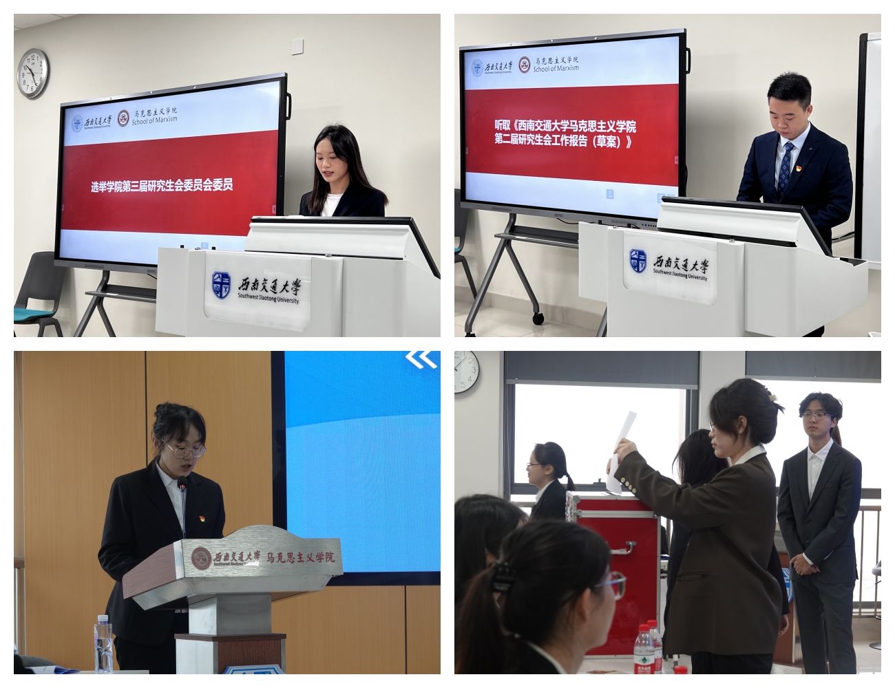 开幕式后,举行了马克思主义学院第三次学生代表大会第一次全体会议、马克思主义学院第三次研究生代表大会第一次全体会议,大会听取与审查了《西南交通大学马克思主义学院学生会工作报告》《西南交通大学马克思主义学院学生会提案工作报告》《西南交通大学马克思主义学院学生会章程修正案(草案)》以及《西南交通大学马克思主义学院第二届研究生会工作报告(草案)》《西南交通大学马克思主义学院第三届研究生会代表大会提案工作报告(草案)》和《西南交通大学马克思主义学院研究生会章程(修正案)》。在分团讨论中,各位代表尽职尽责地对大会工作报告、提案工作等进行了充分而深刻的讨论。在第二次全体会议中,代表们举手表决通过了学生会、研究生会工作报告决议,学生会委员会、研究生会委员会工作报告决议和提案工作报告决议,学生会章程修正案决议(草案)和研究生会章程(修正案)的决议,并完成了新一届学生会委员会委员与主席团成员、新一届研究生会委员会委员和主席团成员的选举工作。