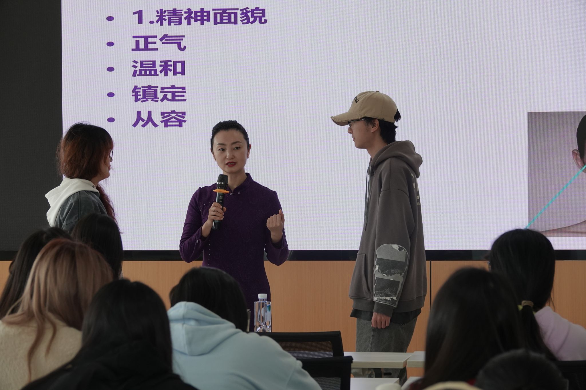 唐丽娟老师以工作职场创设情境,结合自身生活与工作经历,以亲切自然的方式,向大家讲述了生活与工作各方面的礼仪规范。无论是在日常生活中与人见面握手,还是在工作岗位上待人接物,都蕴含着为人处世的礼仪学问。在本次讲座中,唐老师现场指导同学们的说话、走路及入座的身体仪态,让同学们将讲解与实操结合起来。在着装方面,唐老师重点强调服装的得体性,指出服装在社交中具有建立第一印象、体现尊重等重要作用,增强了同学们对日常服装与职业服装的理解,有利于同学们根据不同场合选择得体服装。随后,唐老师亲自演示几种丝巾系法,强调服装上的小配饰也对职场穿搭有较强增色作用,同学们得以将服装礼仪这一概念从理论理解层面转变为更生动的现实体验。