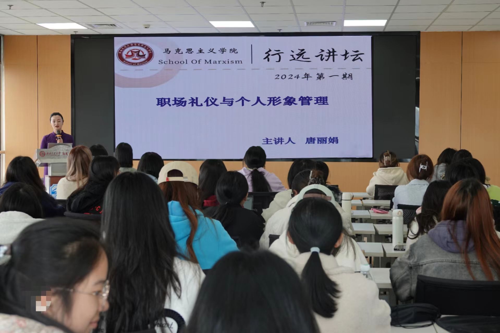 习近平总书记曾指出:“礼仪是宣示价值观、教化人民的有效方式”。从古至今,大到“治国、平天下”,小到“修身、齐家”,中国人民的生活充满着礼仪。为提高同学们自身礼仪修养,为同学们未来更好地谋职就职做准备,马克思主义学院于3月18日14:00在学院报告厅X31325举办了2024年行远讲坛第一期活动,“不学礼,无以立——职场礼仪与个人形象管理”专题讲座。我院邀请到了曾主持完成四川省人文社科项目、现任教于我校人文学院副教授唐丽娟老师作为主讲人。在这场讲座中,大三学生集体参加学习,占参与者的三分之二。