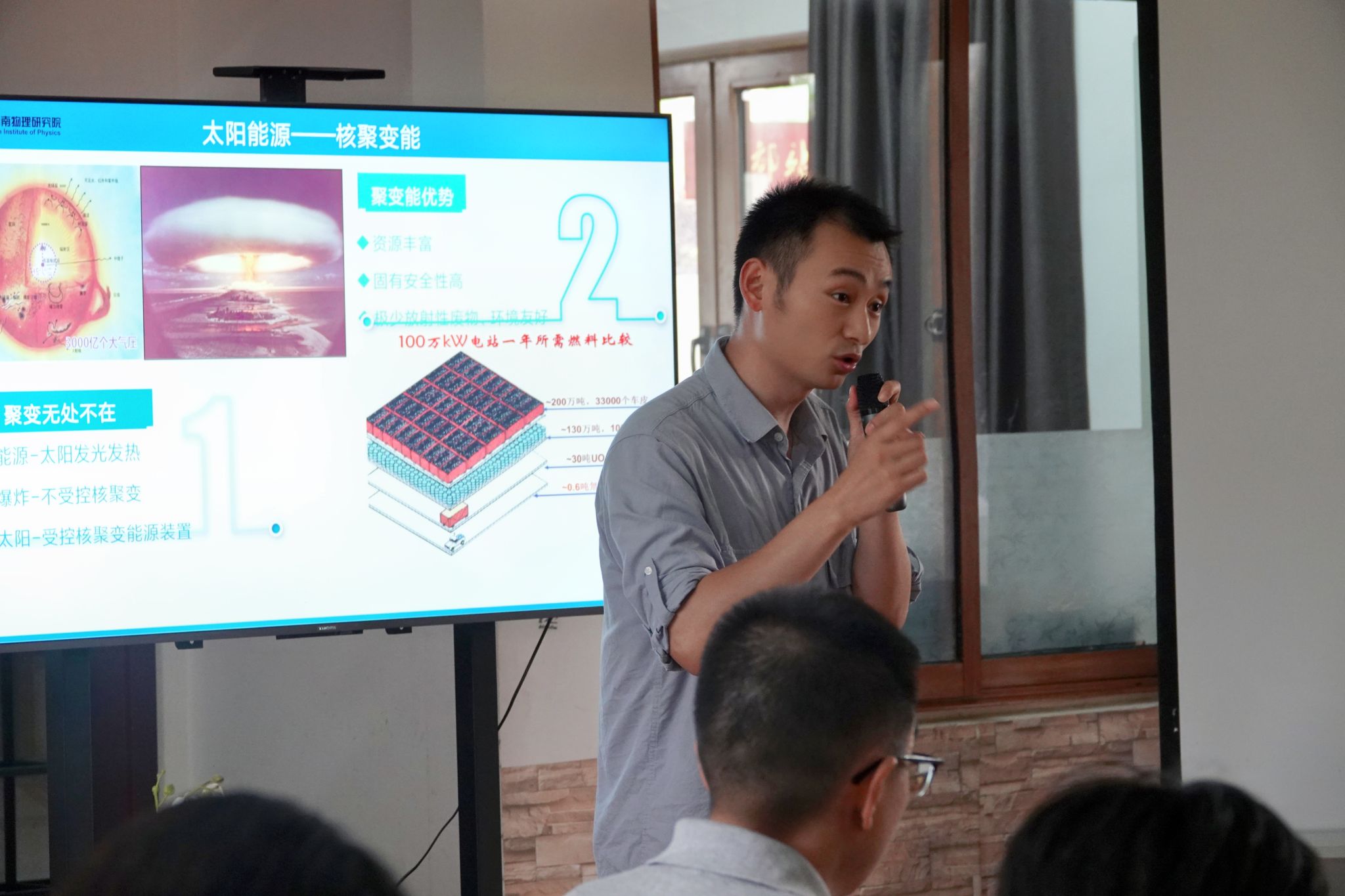 讲座伊始,黄文玉从什么是人造太阳谈起,在分析我国能源现状后,论证了研究人造太阳的必要性。在谈到“人造太阳”的实现条件时,黄文玉列举了诸多例子帮助同学们理解,无论是“交朋友”的生动比喻还是“切苹果”的贴切类比,都将“质量亏损”“核聚变”这样高深的专业词汇变得浅显易懂,让同学们有机会与我国尖端的科研技术“隔空对话”,切实感受到了核物理的温度。
