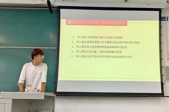 在集体唱诵共青团团歌之后,团课开启了第一项:学习习近平总书记“七一”重要讲话。主持人2019级一班团支书冶学成带领同学们深入领会了七一讲话的核心精神、重大意义与丰富内涵。通过这一学习,同学们回顾了中国共产党建党之初的重大使命与艰苦斗争,了解了百年来中国共产党的辉煌成就与坚定步伐,感悟了未来岁月中国共产党的伟大梦想与奋斗方向。
