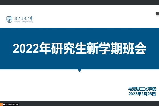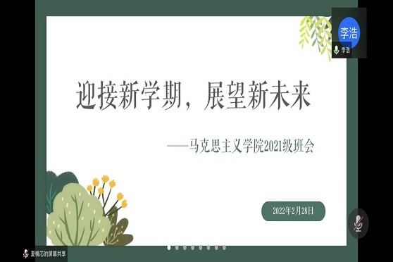 2月28日晚,马克思主义学院2021级本科生主题班会于线上开展,班会由辅导员李浩老师、班导师景星维老师主持。在本次班会中,辅导员李浩老师着重进行了安全教育,再次为同学们讲解了《西南交通大学学生公寓管理办法》,强调同学们要注意用电安全,不使用和存放违章电器,不乱牵电线;不饲养宠物;不存放违禁物品……严格遵守学校学生公寓管理办法。在这之后,李老师带领同学们再次熟悉了学校的最新疫情防控要求,叮嘱同学们遵守疫情防控规定,做好个人防护。紧接着,班导师景星维老师对新学期各学习科目的特点及学习方法进行了讲授,强调无论是专业课还是公共课,同学们都应认真对待,努力提升自己,实现自我,超越自我!
