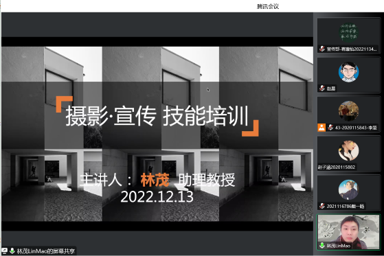 为提升我院学生宣传意识和能力,提高学生摄影技能,12月13日下午,我院开展了以“摄影、宣传技能培训”为主题的线上“青马工程”专题培训讲座。本次活动由我校设计艺术学院助理教授、院国际事务秘书林茂主讲,马克思主义学院团委书记赵晨主持,“青马工程”培训班全体学员共同参与。