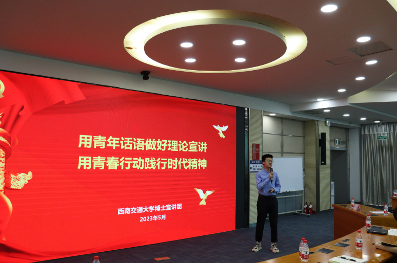 随后,王子琦以《用青年话语做好理论宣讲,用青春行动践行时代精神》为主题对西南交大博士宣讲团建设与发展作专题介绍。西南交大博士宣讲团宣讲育人传统鲜明、载体平台完善,持续加强队伍建设,逐步成为了培养新时代青年马克思主义者的重要平台。