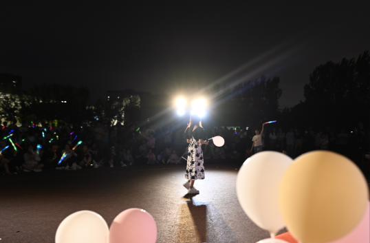 清风徐徐吹来,同学们热情不减。在《想见你想见你想见你》和《不为谁而作的歌》两首歌曲中,演唱者夏杰与同学们积极互动,点燃了现场气氛。随后,姬雅婧和胡馨月合奏的琵琶古筝曲以及潘俊男、孙雨函、吴家朔和杨华峥等分别演唱的《就让这大雨全都落下》《逆光》《说了再见》《亲密爱人》和《慢慢喜欢你》依次随着清风飘扬。在场的观众随音乐挥动荧光棒,沉浸在美妙的音乐世界,大家心在一起、情在一起。
