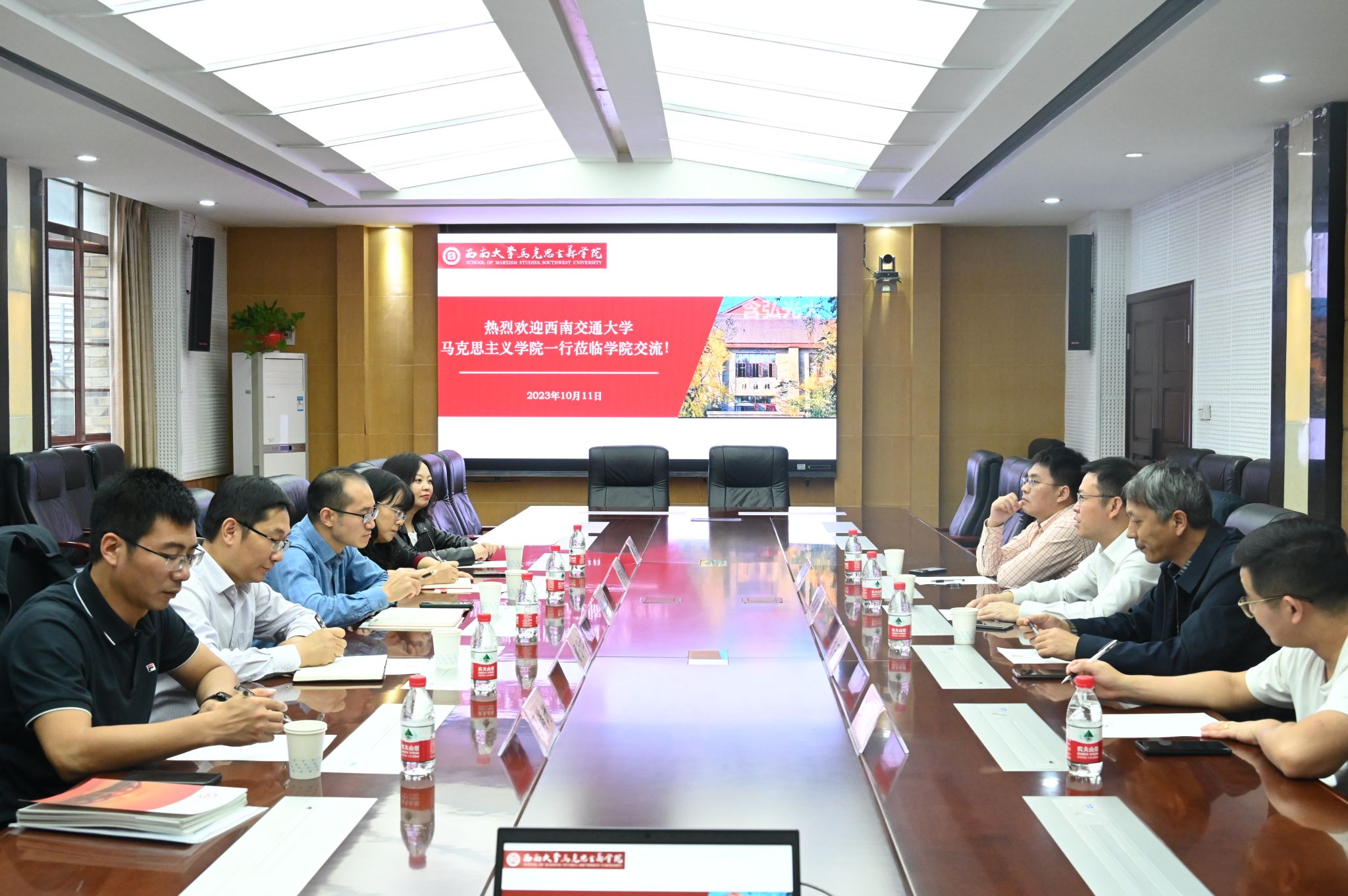 为进一步加强学院马克思主义理论学科建设,结合学院周期目标任务( 2023-2026)要求,对标西南大学马克思主义学院建设,学习借鉴先进经验和做法,2023年10月11日,学院全体班子成员赴西南大学马克思主义学院开展学习调研。西南大学马克思主义学院党委书记廖晓衡、党委副书记刘东升、副院长王丰接待了调研组一行。