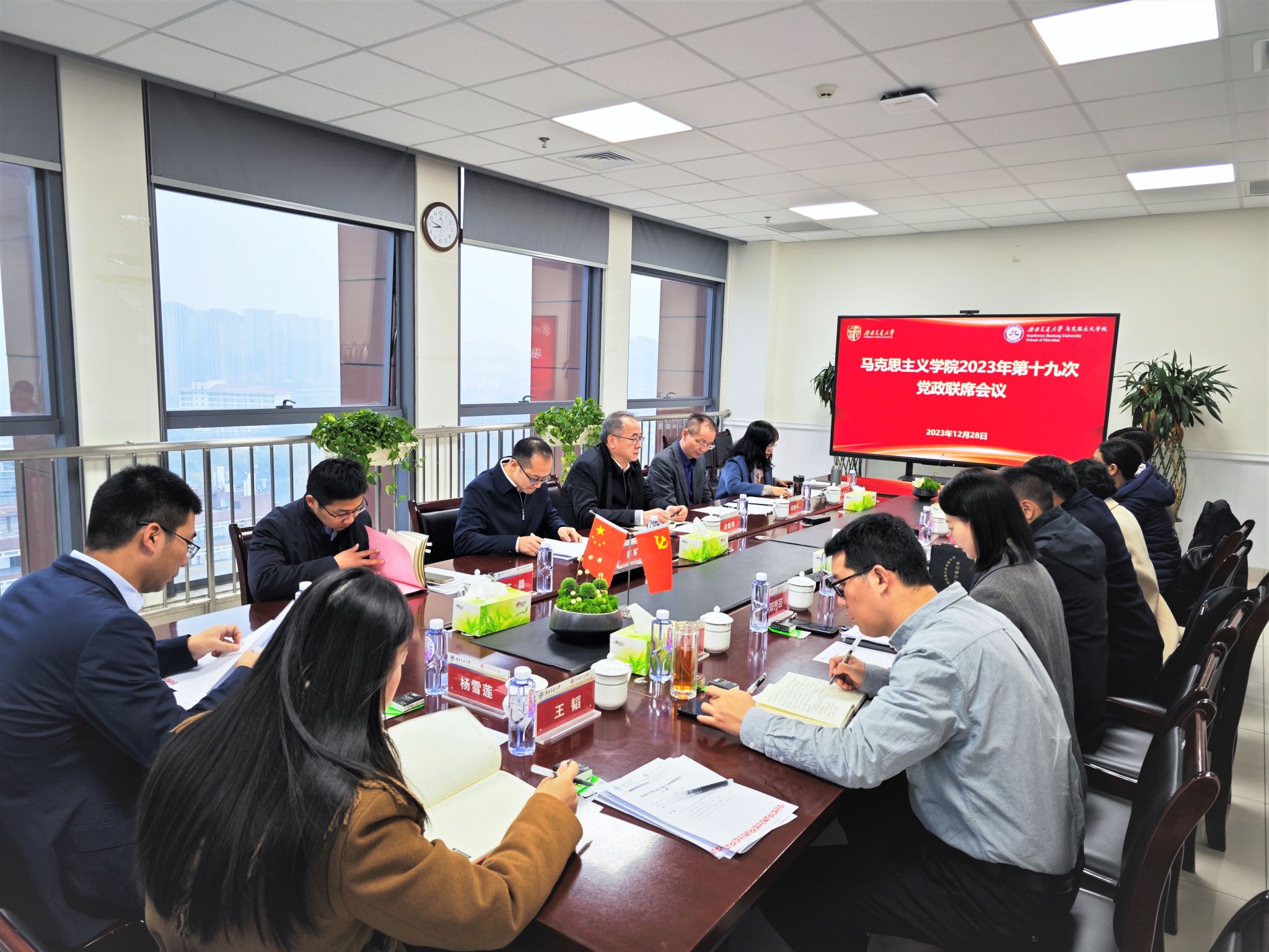 2023年12月28日上午,校党委书记余敏明出席马克思主义学院2023年第19次党政联席会议,并调研思政课教师队伍建设、课堂质量、学生就业等工作。余敏明强调,在学校即将迎来“十四五”收官和130周年校庆之际,希望马克思主义学院能够继续深入贯彻党的二十大精神,突出工作重点、强化工作保障,产出更多优秀成果,提升社会各界尤其是广大校友对学院办学质量的认可度和满意度。