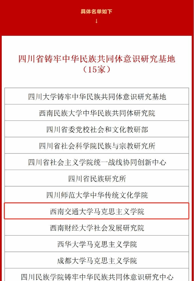 近日,四川省委统战部、省委宣传部、省教育厅、省民族宗教委联合印发《关于命名全省铸牢中华民族共同体意识研究(培育)基地(2023—2025年)的通知》,决定命名全省首批铸牢中华民族共同体意识研究(培育)基地,经过公开申报、联合筛选、实地考察等程序,在学校统战部的领导和帮助下,西南交通大学马克思主义学院成功入选。