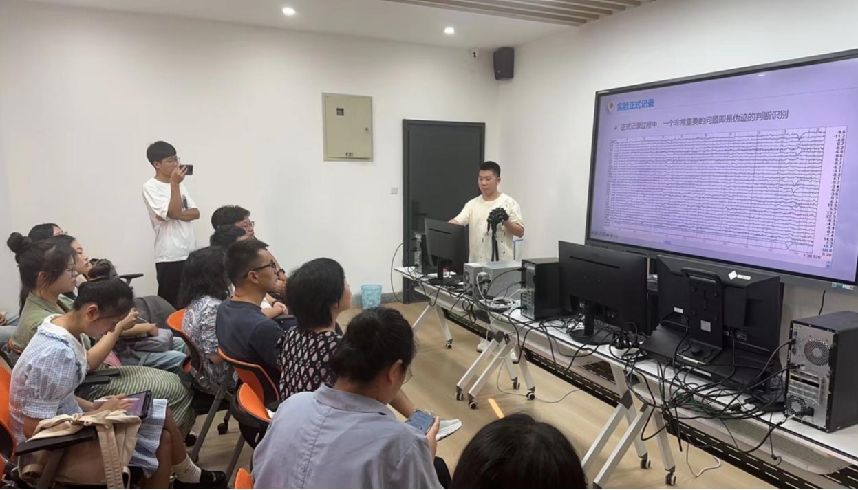 在上午的工作坊中,我院师生对Neuroscan 64-256导脑电采集系统的工作原理、使用方法进行了探索。在工作坊中,师生系统学习了脑电信号的采集以及数据处理的相关流程,掌握了通过仪器快速采集并分析脑电信号,并进行对可视化处理的方法。在实验阶段,师生对被试人员大脑活动状态,以及不同刺激下被试人员的接收反应进行了测试。