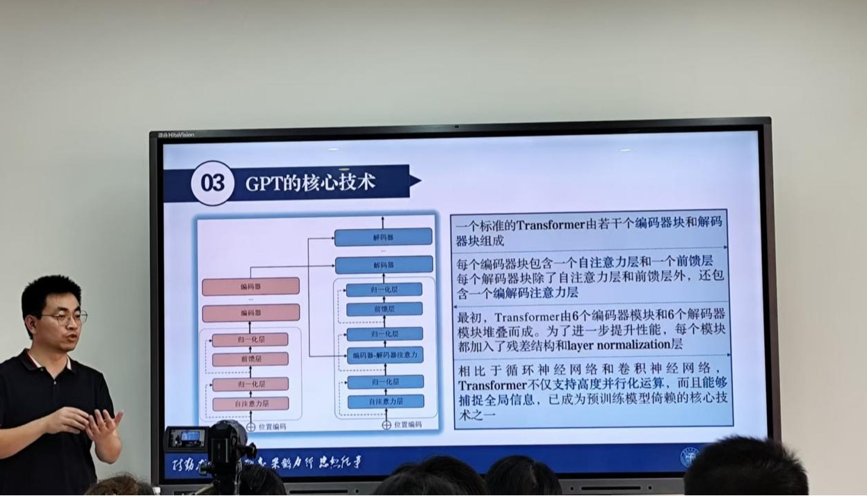 由智超博士在工作坊中介绍了人工智能大模型的发展历程,深入解析了生成式人工智能的核心技术原理,涵盖模型架构、训练方式、数据处理等关键环节。参与工作坊的师生讨论了Transformer模型为通用语言模型奠定技术基础的划时代意义,认为模型的超强学习能力来自大量人力物力所带来的模型参数支撑。