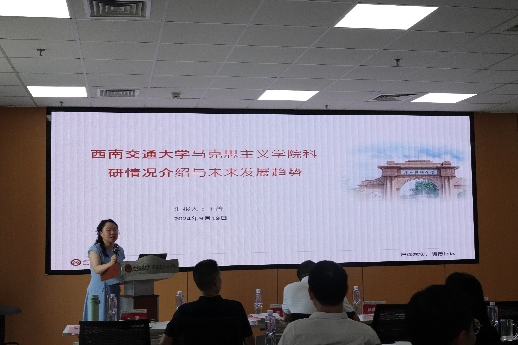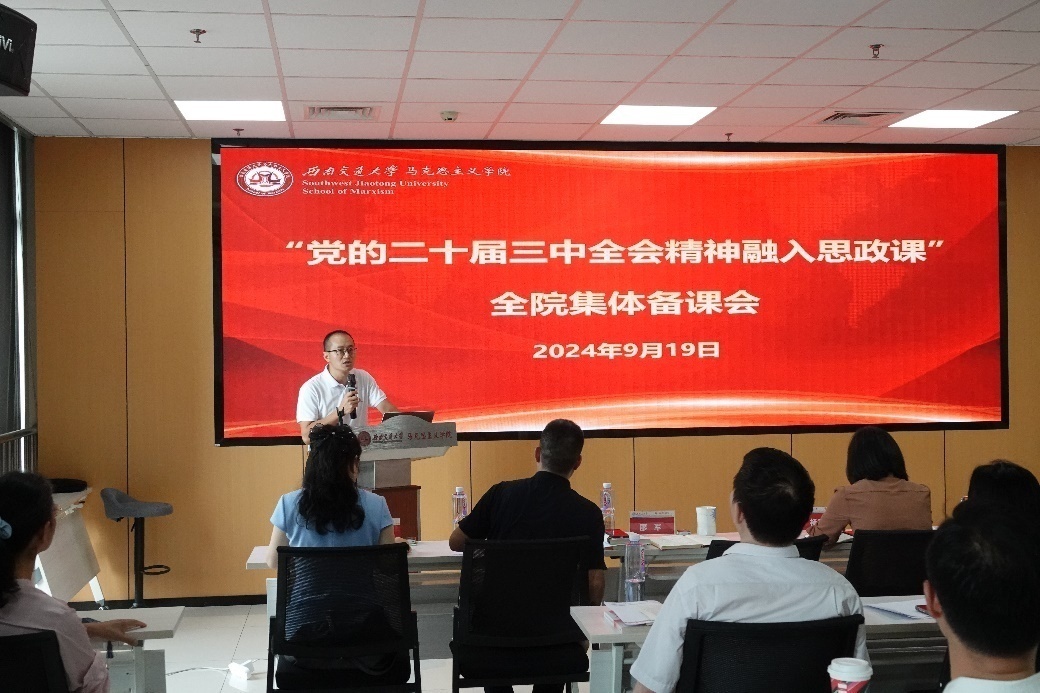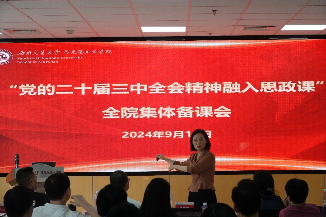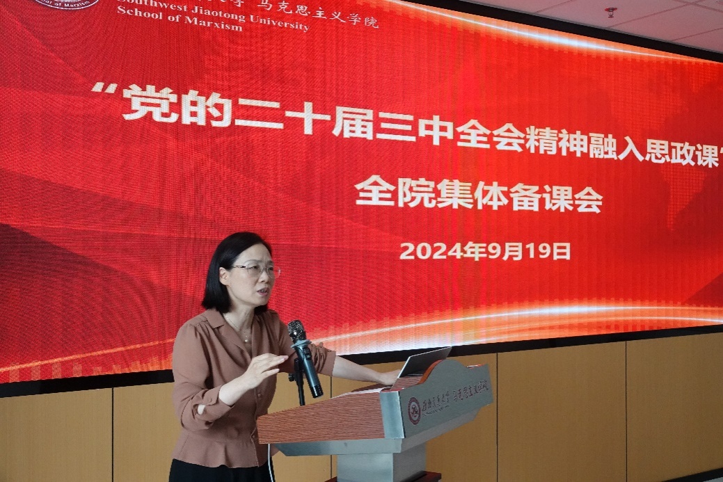 为深入推动党的二十届三中全会精神进课堂、进大学生头脑,用党的创新理论铸魂育人,2024年9月19日下午,马克思主义学院“党的二十届三中全会精神融入思政课”全院教师集体备课会在犀浦校区举行。学校党委副书记杨爱华出席集体备课会并讲话。马克思主义学院党委书记廖军、执行院长田永秀等学院领导,全体思政课教师出席集体备课会,会议由学院党委书记廖军主持。