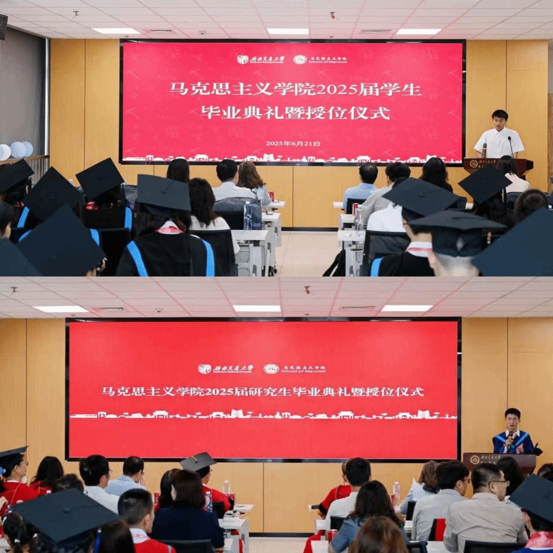 6月21日上午,马克思主义学院2025届学生毕业典礼暨学位授予仪式在马克思主义学院第一报告厅隆重举行。学院领导班子成员、学校原党委副书记何云庵教授、学院原院长林伯海教授、本科生班导师、研究生导师代表、全体辅导员与2025届毕业生齐聚一堂,共同见证这一庄严而喜悦的人生时刻。部分毕业生家长及往届校友到场观礼。