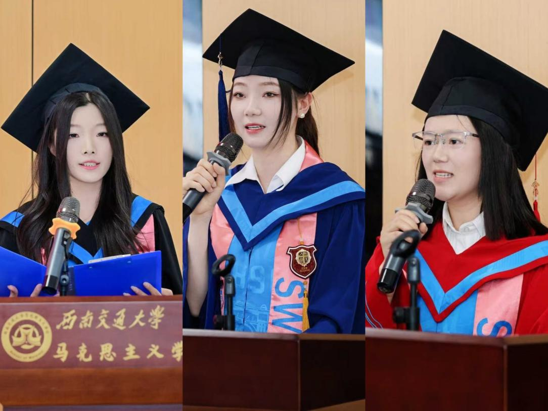 毕业本科生代表丁诗吉和毕业研究生代表贾婷婷、李玉梅分别上台发言。她们深情回顾了在马院求学的难忘岁月,由衷表达了对学院悉心培养、导师谆谆教诲、同窗深情厚谊的无限感激。她们表示,将永远铭记“竢实扬华,自强不息”的交大精神,在未来以专业所学服务社会,建设祖国。临别之际,他们也向同窗送上了前程似锦、鹏程万里的美好祝愿。