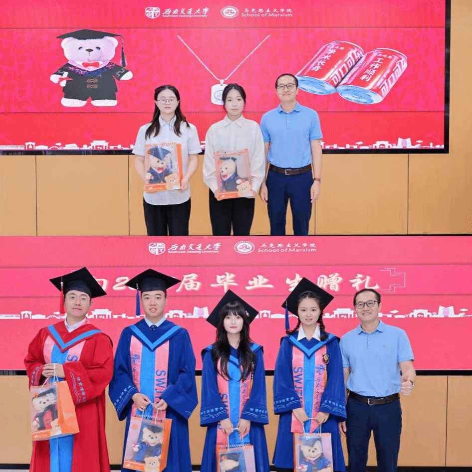 党委书记廖军向毕业生代表赠送了精心准备的“毕业行囊”——定制毕业小熊、刻有毕业生姓名的专属铭牌和可乐。这份独特的礼物承载着学院对学子们的美好回忆和启程祝福,细微之处尽显关怀。