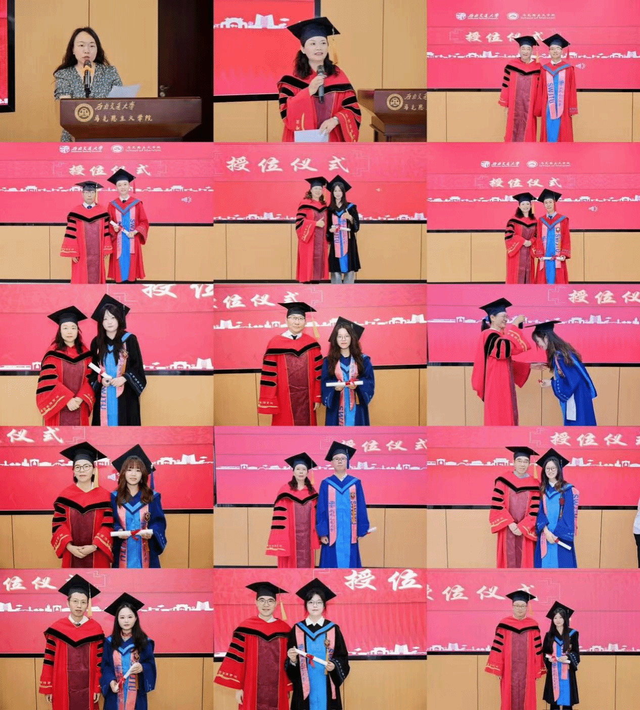 王菁和谢瑜分别宣读了授位决定。导师们逐一为毕业生们拨穗正冠、举行授位仪式。典礼最后,全体师生齐唱校歌,唱响了对学院的热爱和对未来的美好期许,共同见证了这个充满感动和意义的毕业典礼。