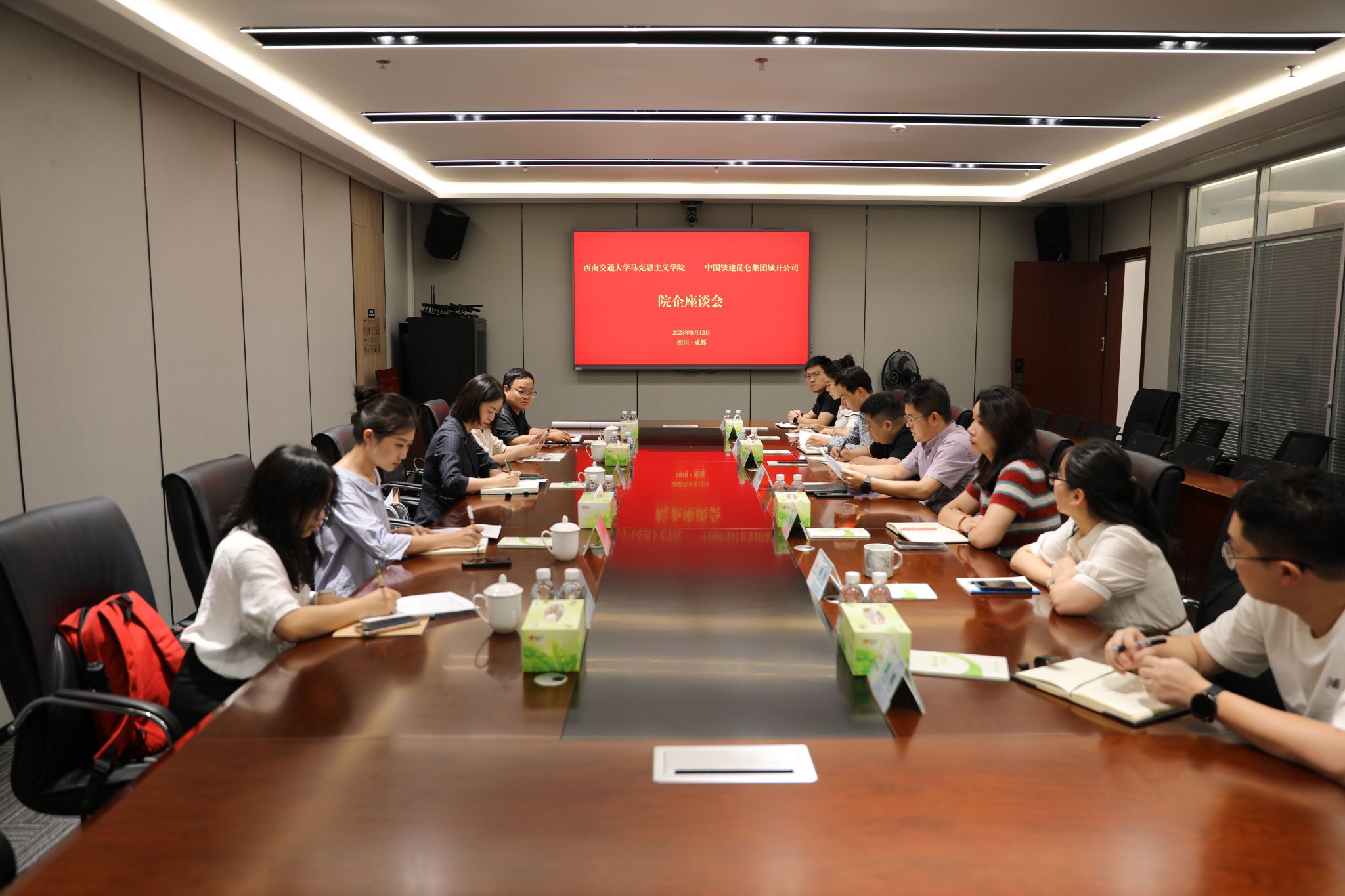 城开公司党群纪检部(人力资源部)部长金丽、财务资金部部长郑浩等就公司党团青工作作了系统汇报,重点阐述了干部人才队伍建设、青年员工培养机制以及党建工作的创新实践,实施“双导师制”助力青年成长,并表示非常欢迎西南交大马院毕业生到城开公司实习、就业。