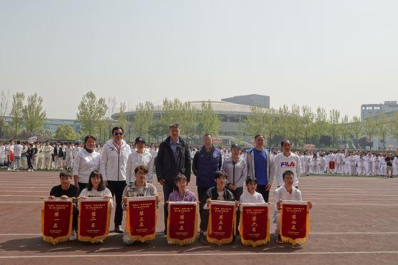 随后比赛正式开始,学院两两一组依次进行比试。马克思主义学院凭借整齐划一的动作和别出心裁的队形设计在乙组中脱颖而出,拿下了乙组第二名的好成绩。最后,全体参赛队员与锦旗合影留念,记录这激动人心的瞬间。