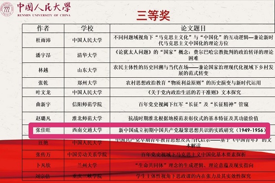 “五四杯”全国高校马克思主义理论类本科生学术论文竞赛作为目前唯一面向全国本科生的马克思理论学术竞赛,旨在挖掘培养优秀的本科生马克思主义理论研究人才,具有极高权威性与知名度,自启动以来便得到全国马克思主义本科生的广泛关注。本次竞赛共征集来自全国一百二十三所高校的四百二十余篇有一定质量、特色、心意的学术论文。经主办方聘请有关专家进行严格评审后,最终确定46篇论文获得第三届“五四杯”全国高校马克思主义理论类本科生学术论文竞赛一、二、三等奖及优秀奖。其中,我院张佳旺同学的论文《新中国成立初期中国共产党凝聚思想共识的实践研究(1949-1956)》获得了全国三等奖。交流会中,他从凝聚思想共识何以必要、何以可能与何以实现的三重逻辑做了论文报告,探寻了新中国成立初期中国共产党凝聚思想共识的运行机制,中国人民大学马克思主义学院副院长宋学勤针对张佳旺同学的论文分享进行了详实的点评。