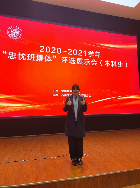 2021年11月23日下午,我校于交运楼418报告厅成功举办了2020-2021学年本科生“忠忱班集体”评选展示会。马克思主义学院思政2018-01班被授予西南交通大学最高集体荣誉——“忠忱班集体”。
