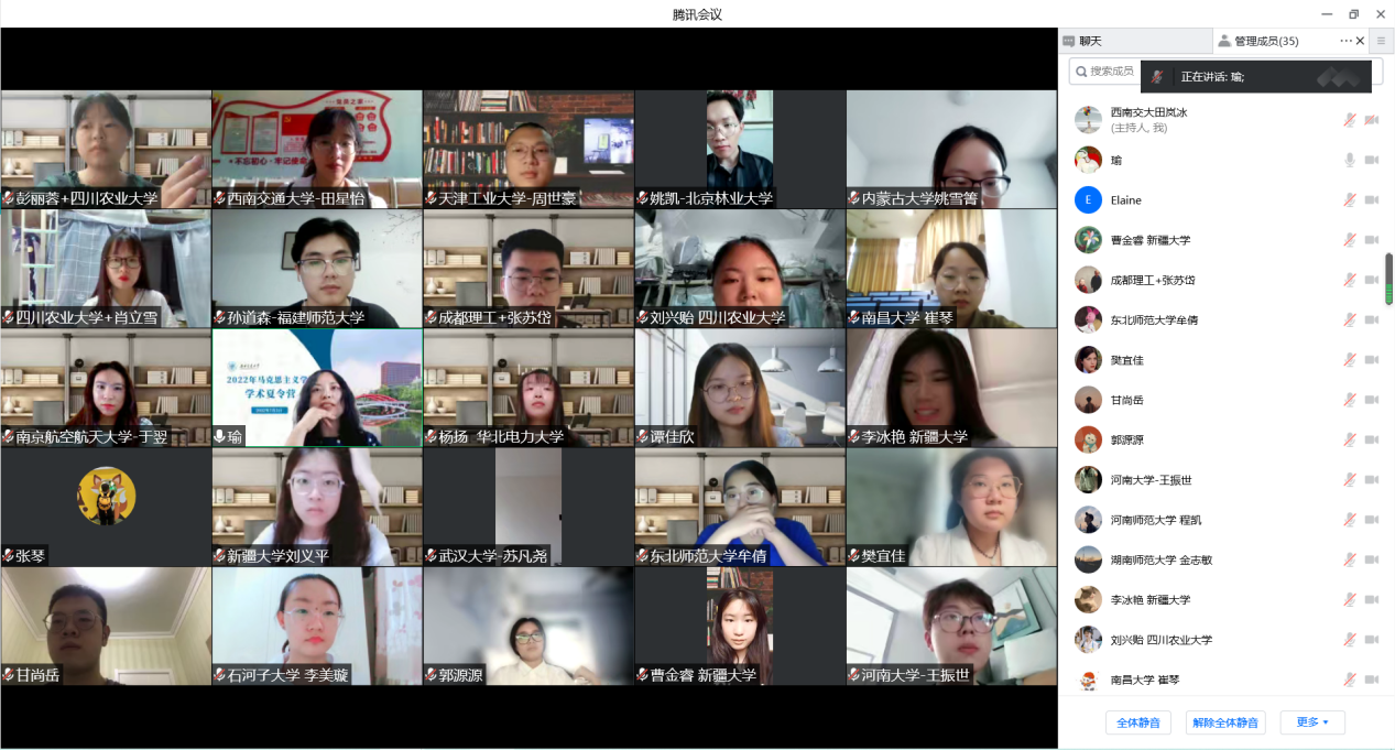 上午9点,开营仪式在腾讯会议平台正式进行。首先,由马克思主义学院副院长谢瑜老师主持了开营仪式,她向来自五湖四海各大高校的营员表示欢迎,并希望全体营员能够珍惜本次学术夏令营的机会,积极与老师进行沟通,遵守相关规定,并在本次夏令营中充分展现自己。