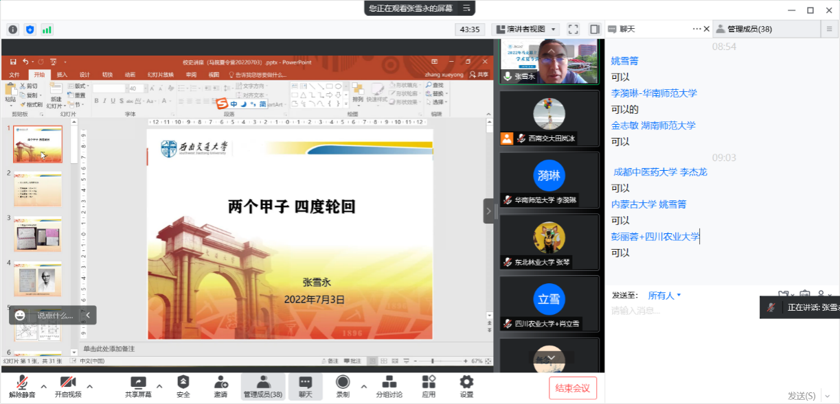 随后,文科建设处处长张雪永老师、马克思主义学院执行院长田永秀老师分别讲述了西南交通大学校史和马克思主义学院院史。张处长带领营员们跟随学校的办学历程,从唐山到成都,从华北到西南,感叹历经整整5万里跋涉、18次迁徙、17次更名的背后,深情讲述“竢实扬华、自强不息”的交大精神。田院长接着讲述学院从人文社会科学学院到政治学院再到马克思主义学院的经过,从学院基本情况、研究生的培养特色、强大的科研团队、充分的支撑和保障条件几个方面向营员们全面地介绍了学院的情况,希望此次夏令营成为广大优秀学子选择推免或报考交大马院的契机。