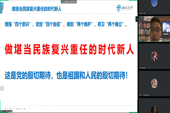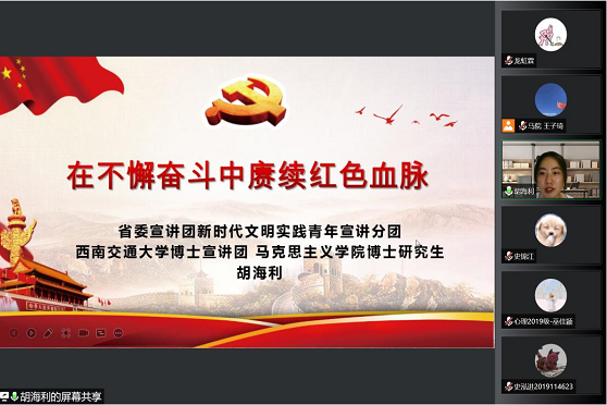 为深入学习贯彻习近平新时代中国特色社会主义思想、献礼党的二十大,西南交通大学博士宣讲团近期以“喜迎二十大、永远跟党走、奋进新征程——在历史和现实的映照中凝聚青年力量”为主题开展多场线上宣讲。宣讲由博士宣讲团成员王子琦主持,马克思主义学院、力学与航空航天学院、心理研究与咨询中心、数学学院的本科生参与。