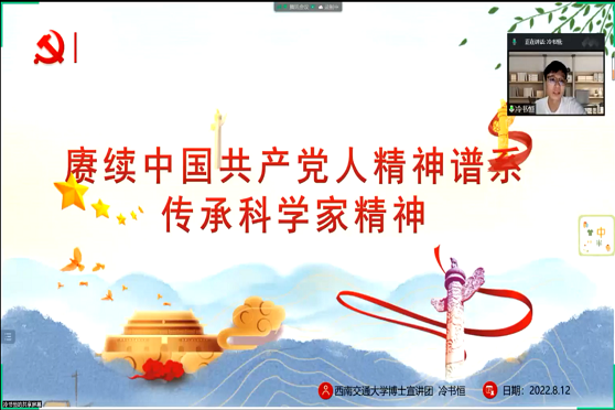8月12日19:30,冷书恒以“赓续中国共产党人精神谱系,传承科学家精神”为主题,宣讲党的百年奋斗形成了以伟大建党精神为源头的精神谱系,并结合习近平总书记关于科学家精神的论述,讲述了科学家精神的内涵:胸怀祖国、服务人民的爱国精神,勇攀高峰、敢为人先的创新精神,追求真理、严谨治学的求实精神,淡泊名利、潜心研究的奉献精神,集智攻关、团结协作的协同精神,甘为人梯、奖掖后学的育人精神。他以生动形象、贴近生活的案例号召青年学子勤学苦练、学以致用,争做重大科研成果的创造者,在科研道路上取得更多突破,肩负起历史赋予的科技创新重任。
