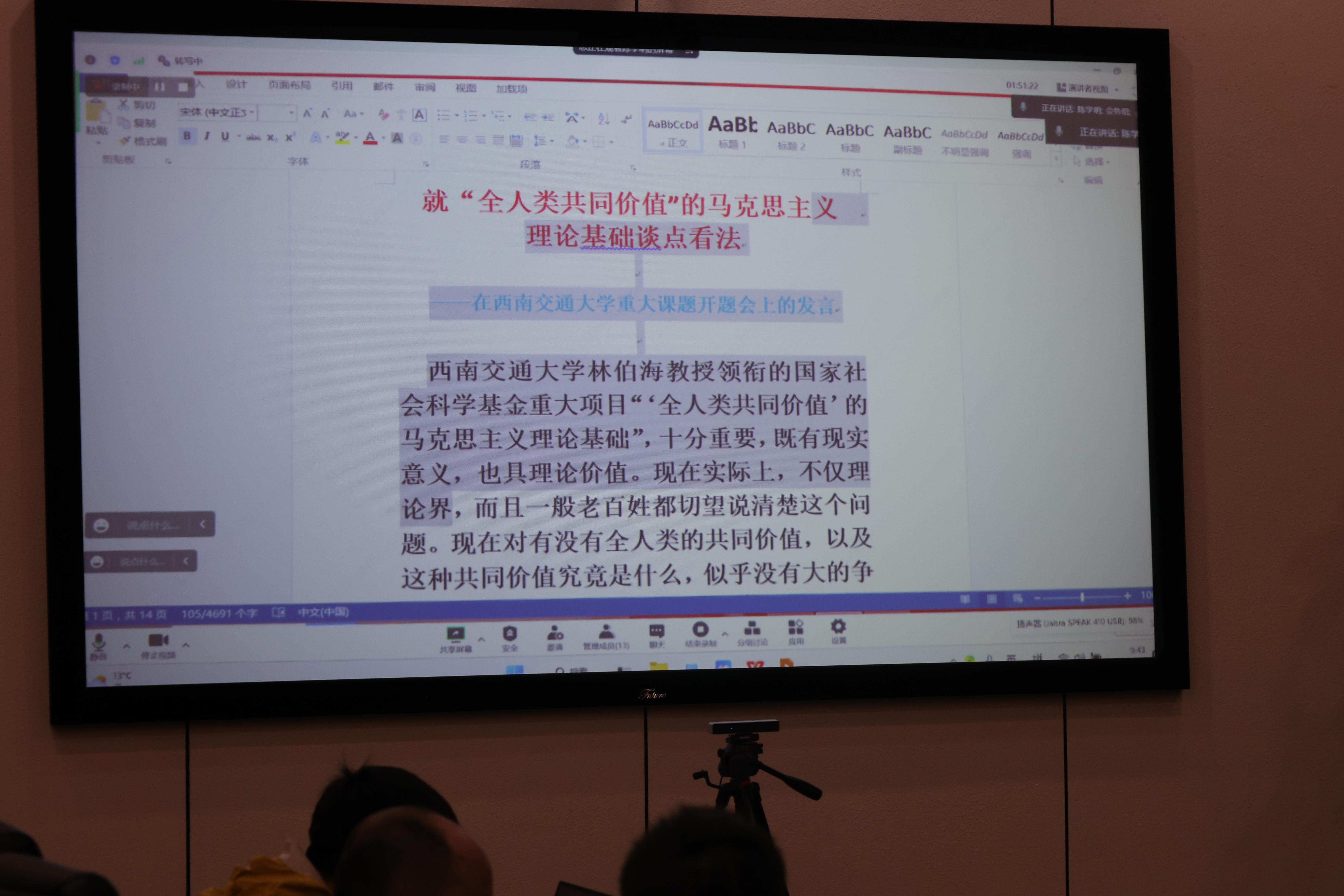 开题会由专家组组长中国人民大学郝立新教授主持。重大课题首席专家、西南交通大学马克思主义学院林伯海教授做开题汇报,复旦大学陈学明教授、山西大学马俊峰教授、北京大学孙来斌教授、东北大学田鹏颖教授、北京大学陈培永教授、武汉大学项久雨教授做主题发言,开题会以线上、线下相结合的方式进行。
