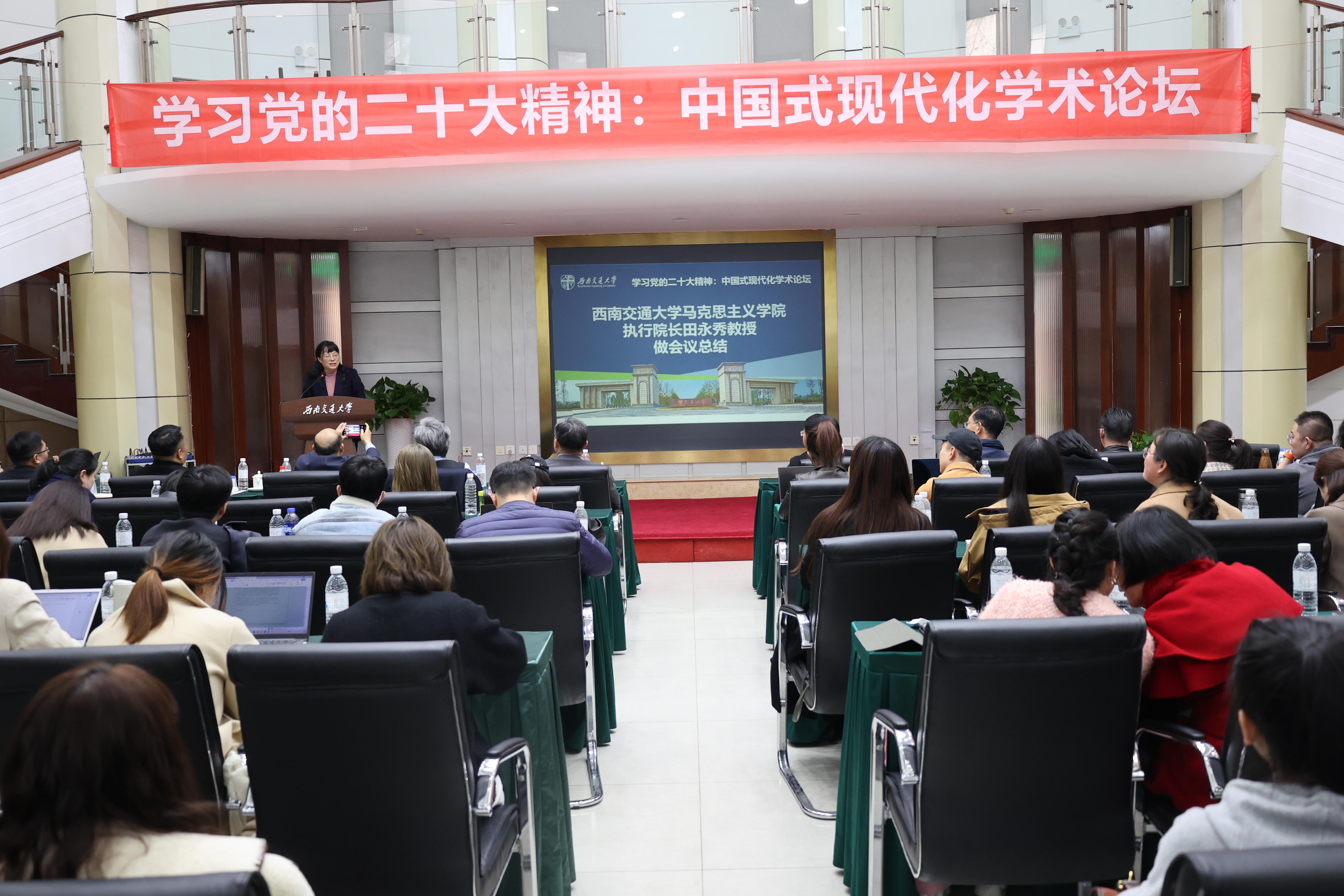 马克思主义学院执行院长田永秀教授做总结发言,她指出此次学术论坛不仅加深了我们对于中国式现代化的理解,也从视野、思路、方法论等方面对我们做研究给予了极大启发,让我们深刻感受了各位专家思想的深邃。她表达了对各位专家真挚的感谢,期待各位专家再次拔冗莅临交大马克思主义学院指导。
