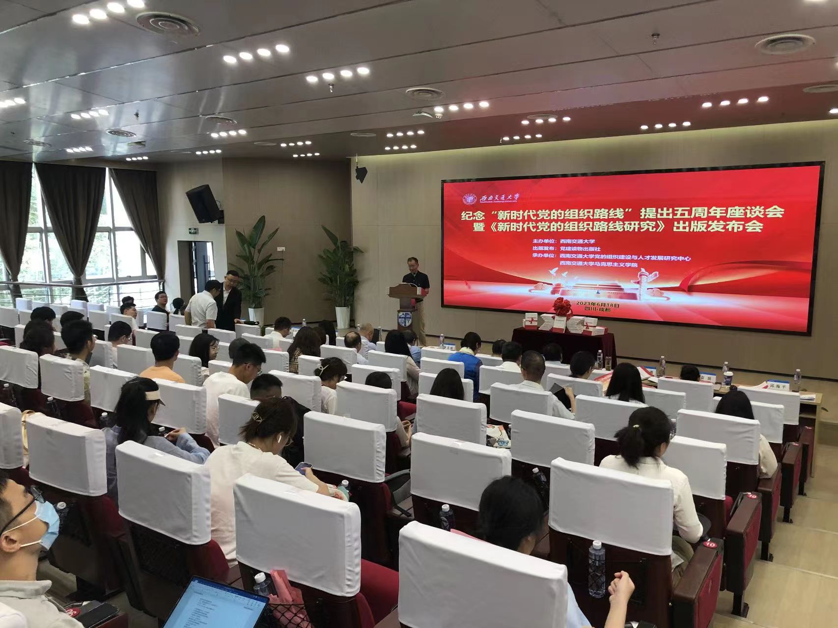 座谈会上,西南交通大学与党建读物出版社共同举行了《新时代党的组织路线研究》新书发布仪式。党建读物出版社总编室主任张弘骏在发布辞中表示,该书结构严谨,从中国共产党的组织体系建设、干部队伍建设、人才队伍建设、组织制度建设等不同层面,剖析新时代党的组织路线的科学内涵与实践经验,结构设计合理,内容提纲挈领,对学习贯彻新时代党的组织路线具有积极意义。