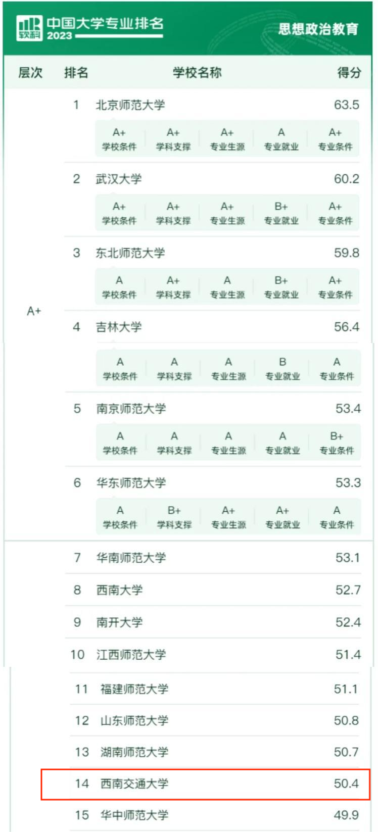 2023年6月15日,高等教育专业评价机构软科正式发布“2023软科中国大学专业排名”,在最新的排名中,我院思想政治教育专业位居全国第14位,获评等级A。
