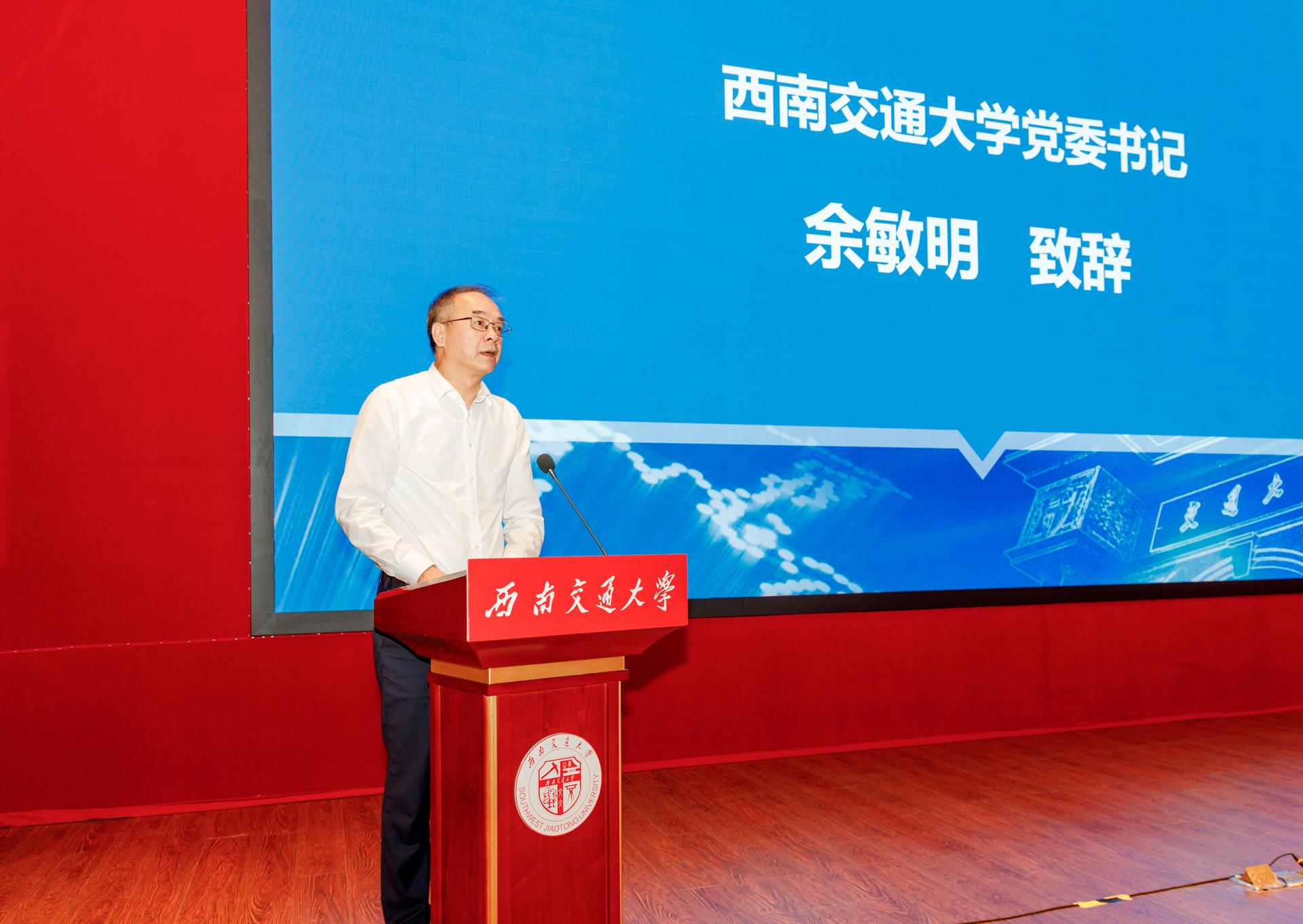 大会开幕式上,西南交通大学党委书记余敏明发表了热情洋溢的致辞,向交通强国科学家精神教育基地的揭牌和大会的召开表示祝贺,对出席会议的领导和专家学者表示欢迎,对四川省科协、省教育厅、省科技厅等有关部门对学校交通强国科学家精神教育基地建设的指导和支持表示感谢。余敏明指出,揭牌成立交通强国科学家精神教育基地,举行中国共产党人精神谱系融入学校思想政治教育研讨会,正是站在党和国家事业薪火相传、后继有人的战略高度,贯彻落实总书记重要指示批示精神的重大举措。希望马克思主义学院认真总结会议成果,着力将交通强国科学家精神教育基地建设成为具有创新性、示范性和引领性的科学家精神育人高地,形成立德树人知名品牌,推动中国共产党人精神谱系融入思想政治教育研究,为大力培养堪当强国建设、民族复兴重任的时代新人作出贡献。