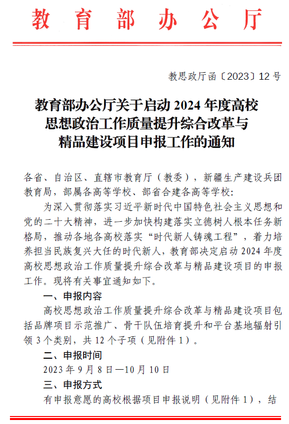 【转发】教育部办公厅关于启动 2024 年度高校思想政治工作质量提升综合改革与精品建设项目申报工作的通知