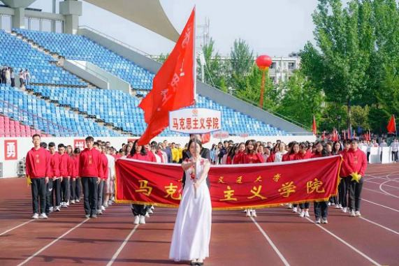 On April 16, our University’s 121st Games and the 125th Anniversary Games of Southwest Jiaotong University officially kicked off in the North Stadium at Xipu Campus.At 8:30, the opening ceremony officially began. A phalanx composed of national defense students came to the center of the venue, kicking off the opening ceremony. "Now walking towards us is the representative team of the School of Marxism, full of energy and walking calmly." Following the host’s words, the School of Marxism’s phalanx team walked towards the rostrum in neat steps. "The School of Marxism creates greater glories", this resounding slogan showed the vitality of our School. Wearing red team uniforms with the Chinese character China and holding a bright yellow five-pointed star, students of the School of Marxism arranged a formation of 100 and a Party emblem pattern, expressing their sincere blessings for the centenary of the CPC.