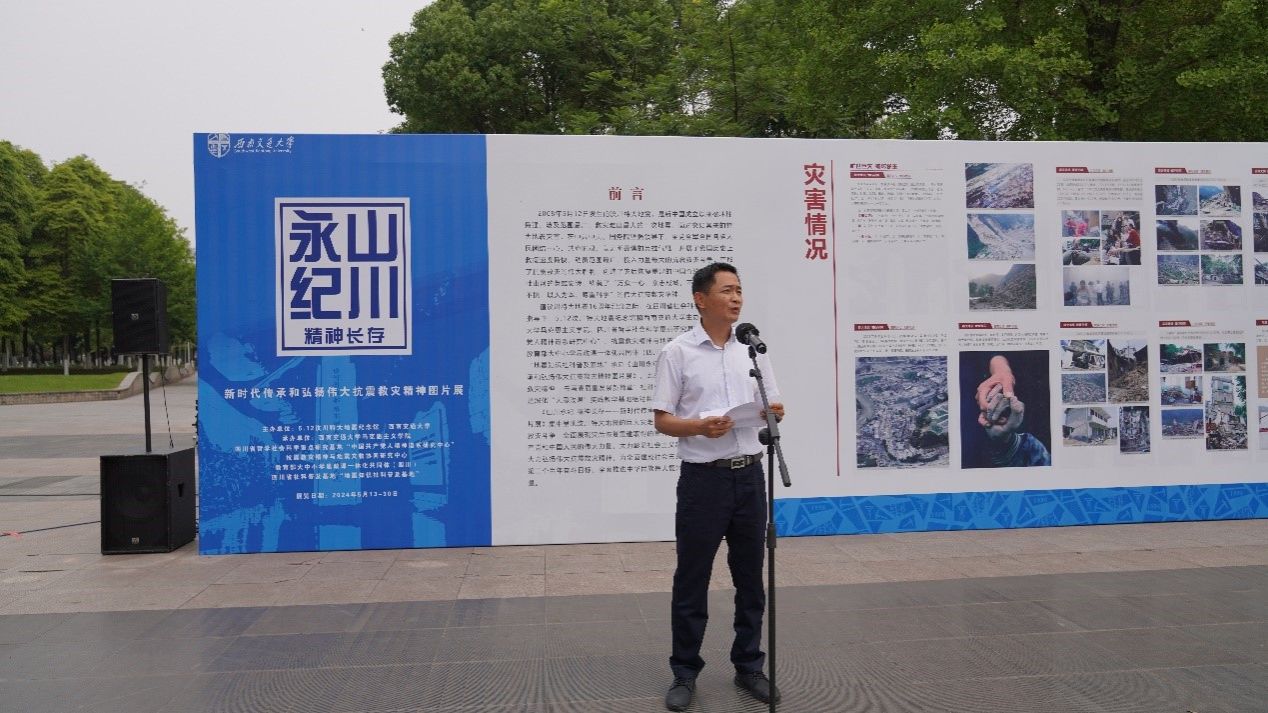 为深入学习贯彻“习近平对学校思政课建设作出重要指示”精神,学习贯彻习近平总书记关于传承和弘扬中国共产党人精神谱系的重要论述,2024年5月17日上午,《山川永纪 精神永存——新时代传承和弘扬伟大抗震救灾精神图片展》启动仪式在西南交通大学成功举办。西南交通大学党委副书记杨爱华同志、四川省社科联科普处一级调研员宋歌处长、5·12汶川特大地震纪念馆馆长何瑞雪同志,以及西南交通大学党委宣传部李猛副部长、马克思主义学院党政班子成员、教师代表、学生代表参加启动仪式。西南交通大学马克思主义学院执行院长田永秀教授主持启动仪式。