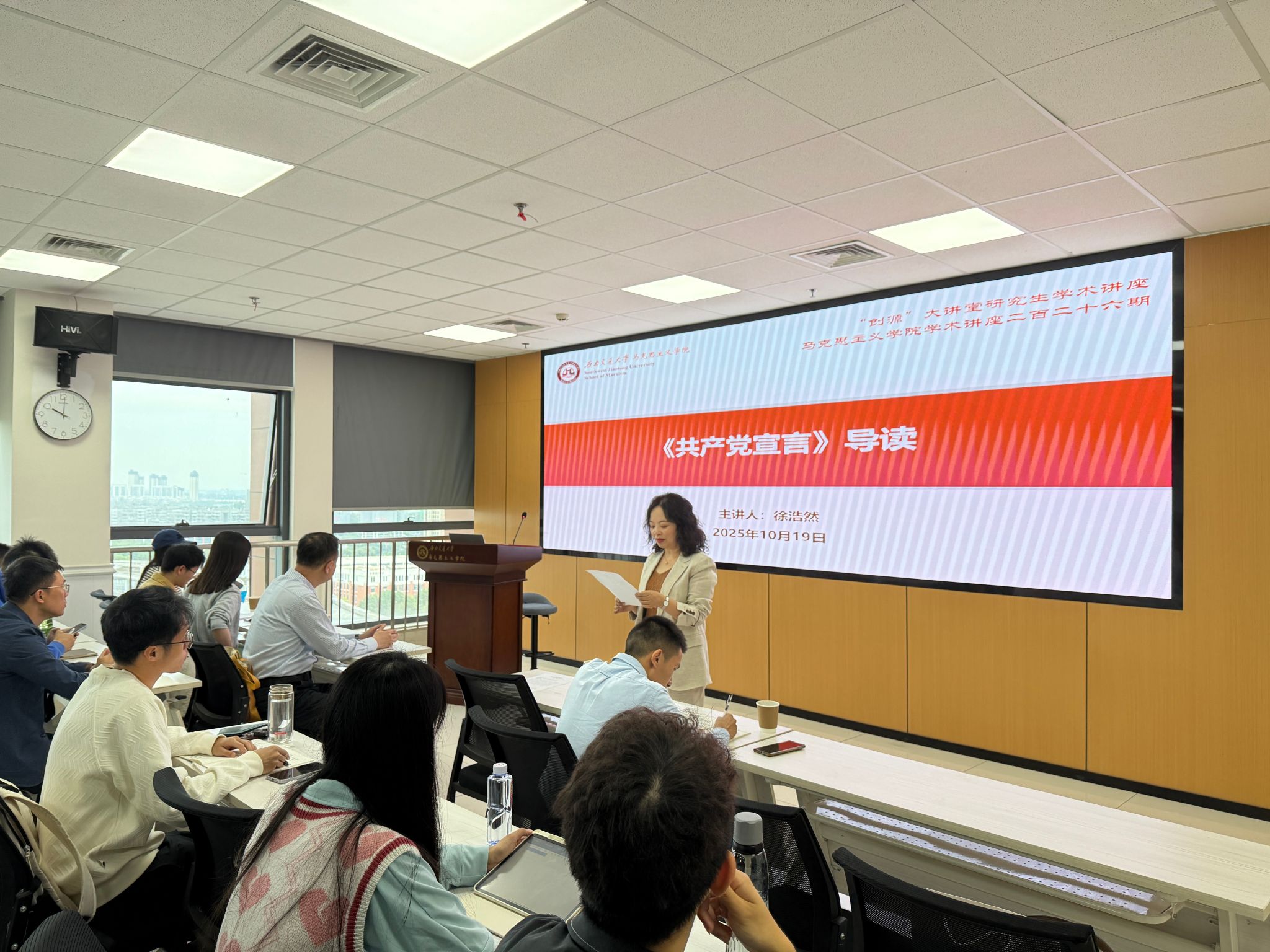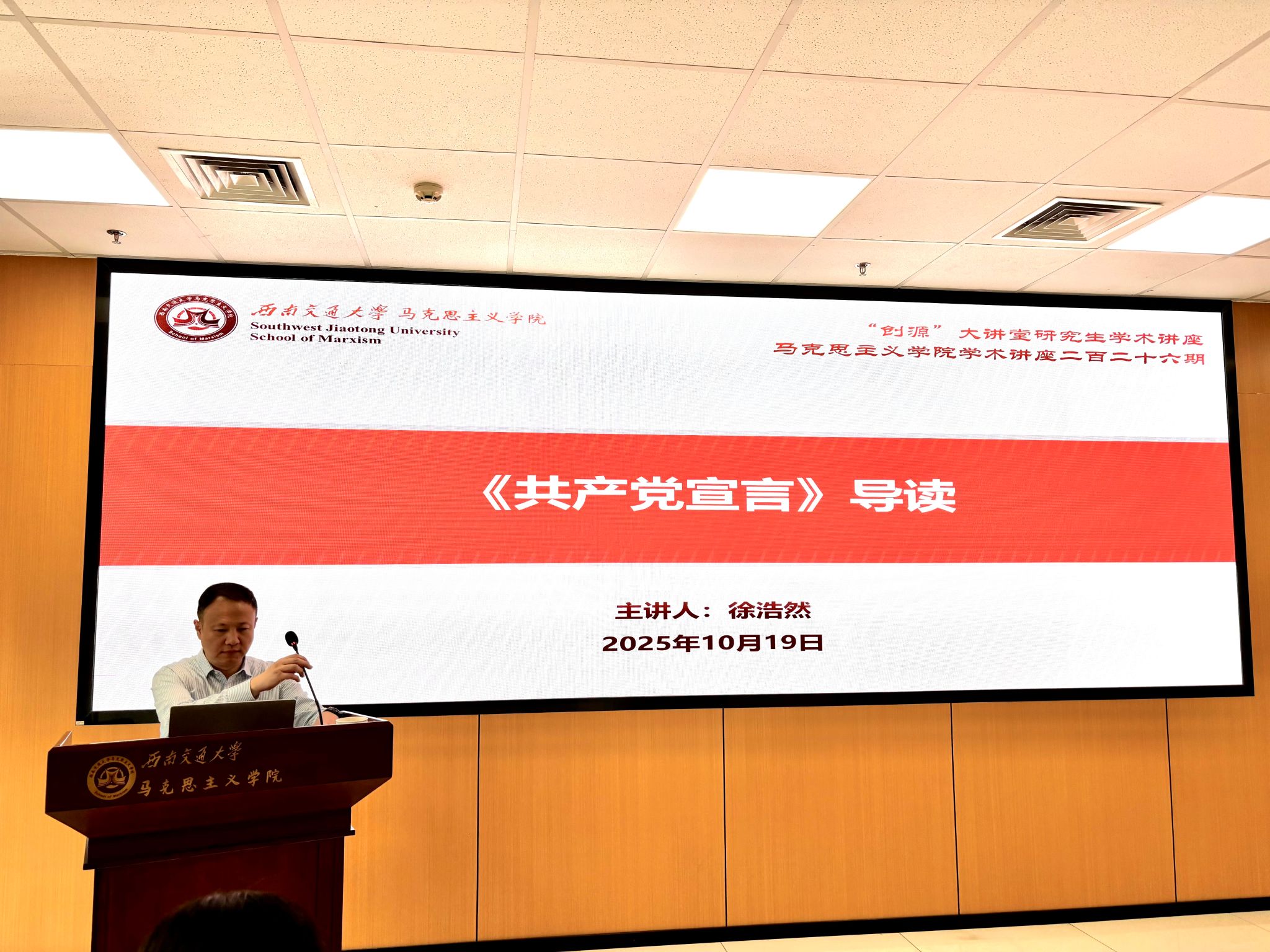 10月19日,中央党校(国家行政学院)科学社会主义教研部博士生导师、社会主义发展史教研室主任徐浩然教授为我院的硕士、博士研究生带来了一场以《共产党宣言》导读为主题的专题讲座。讲座由西南交通大学马克思主义学院副院长谢瑜主持。